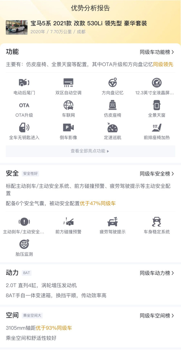 综上所述的新车含税价、用车成本、市场行情、优势分析、同款比价等数据仅供参考。在配置部分,因为二手车非标品,车辆可能会存在配置改装的情况,具体车况信息需要线下结合车辆实际情况进行综合参考。